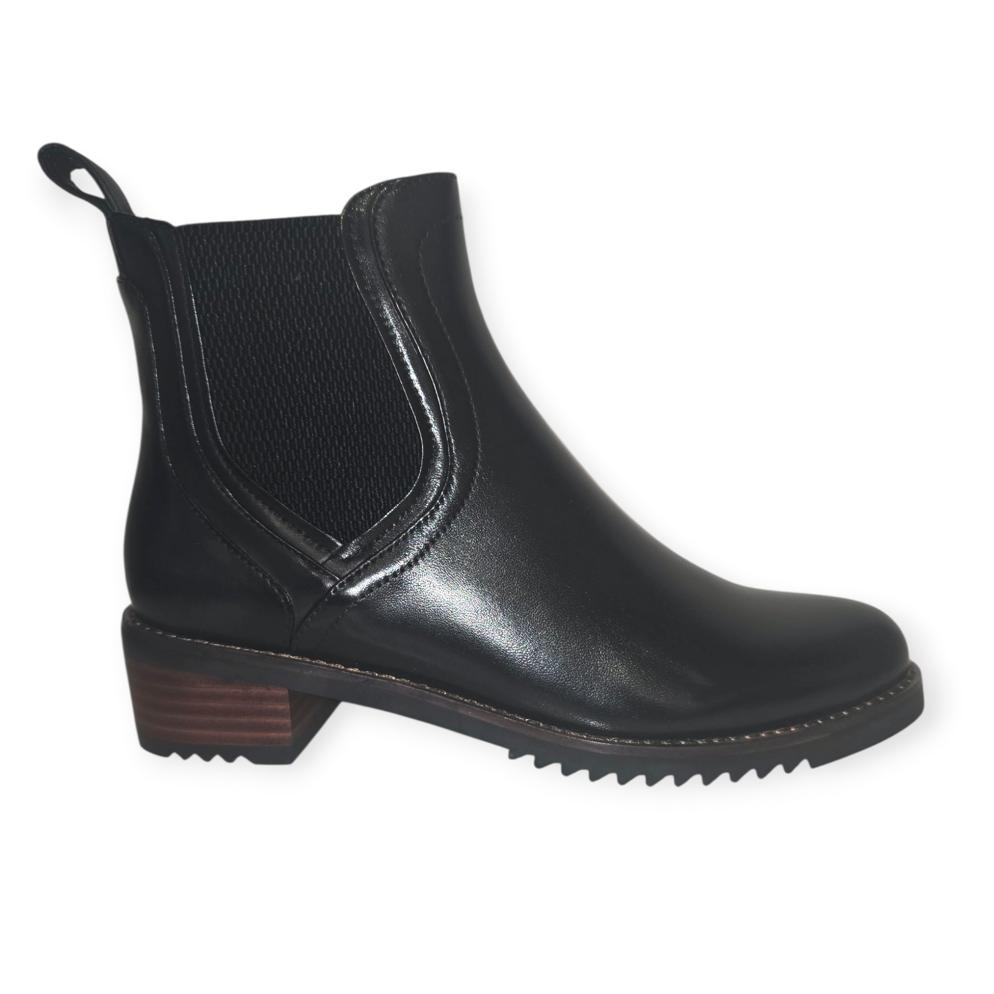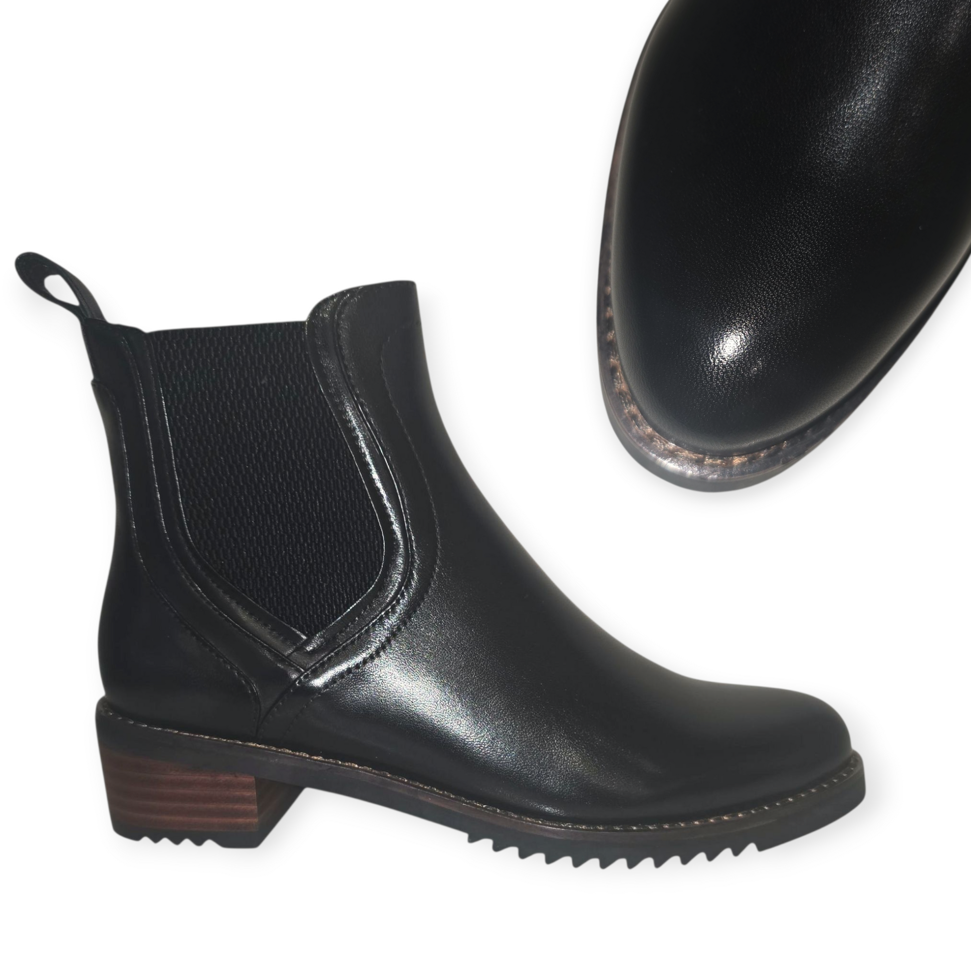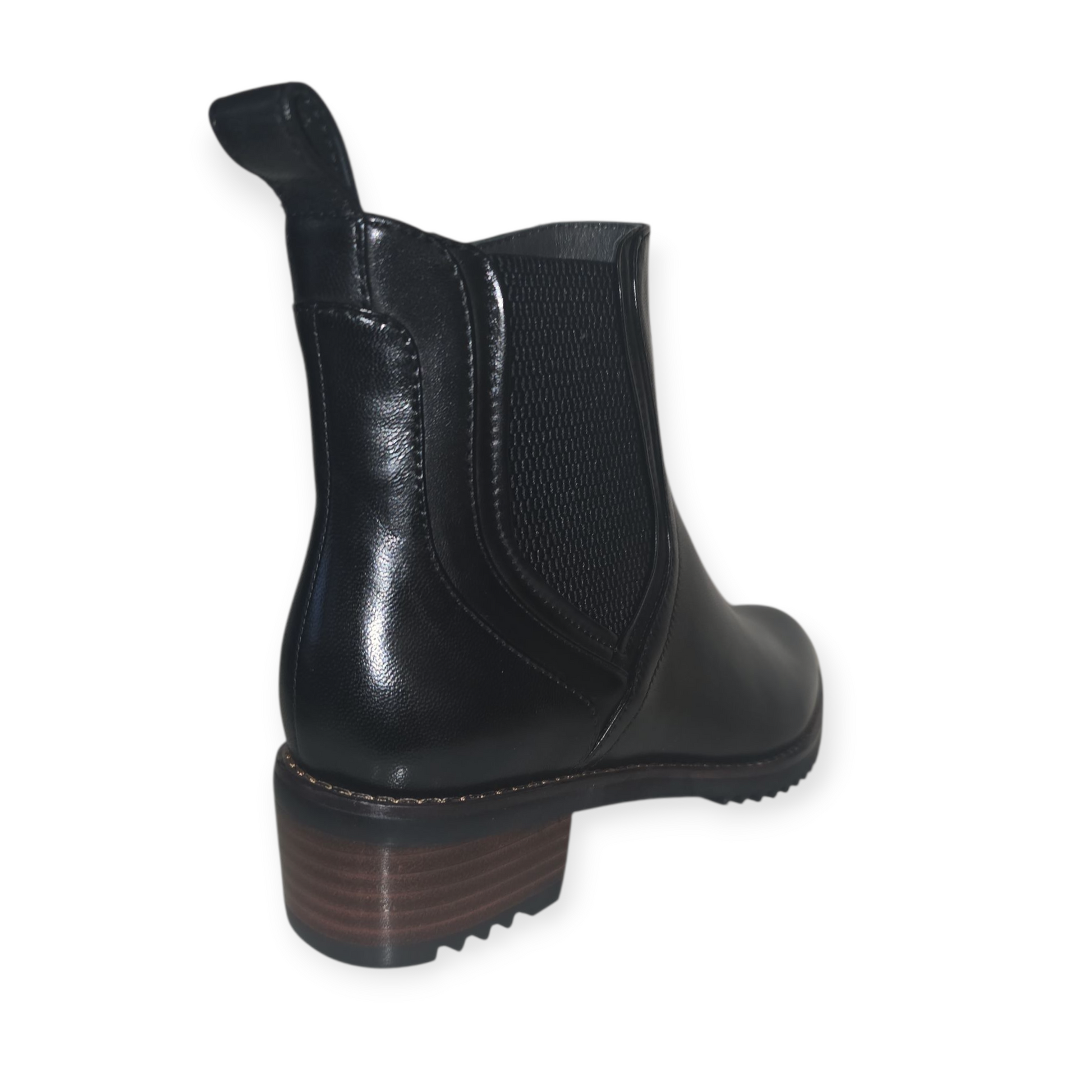 Black leather ankle boot, zip on inside. Fur lined.